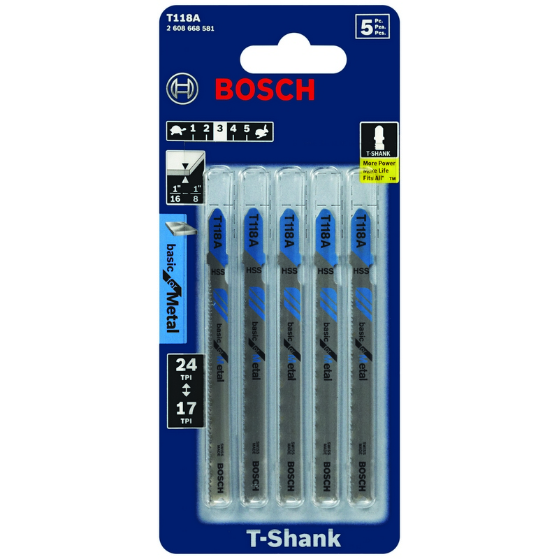 Includes: (5) 3-5/8 In. 17-24 TPI Basic for Metal T-Shank Jig Saw Blades