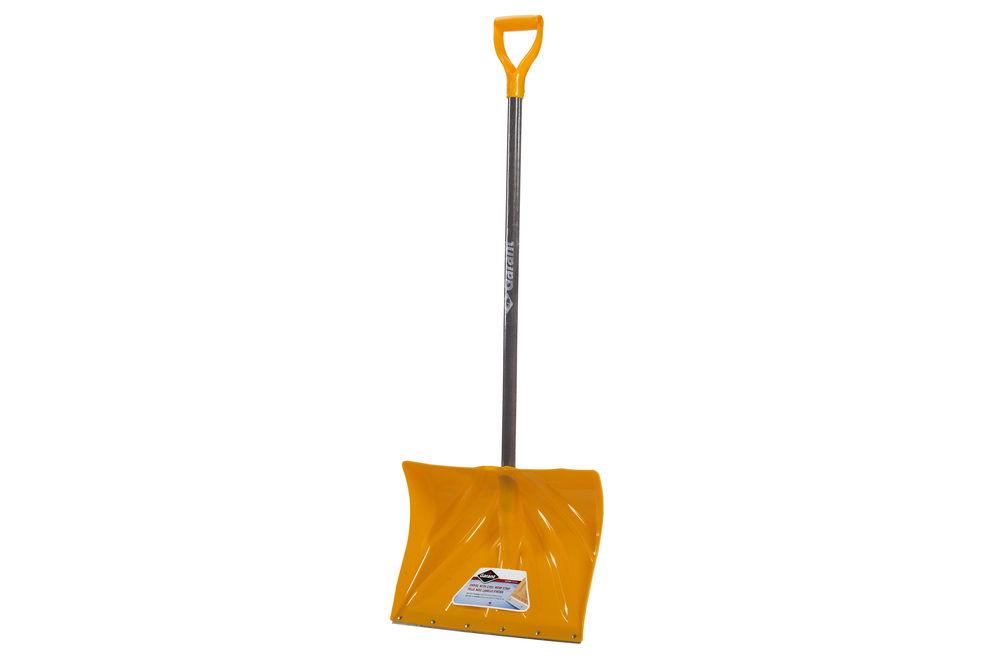 Mountain Mover, 18 in. yellow poly blade with a steel wear strip, stained ash handle.