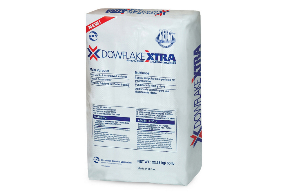 Oxy DOWFLAKE Calcium Chloride Flakes, 20 kg bags improve safety for drivers and pedestrians by treating roads, parking lots, driveways and walkways with DOWFLAKE Xtra 83-87% Calcium Chloride. With 10% more calcium chloride than other conventional 77% assay flake products, DOWFLAKE Xtra is concentrated, so it works faster and you can apply less.