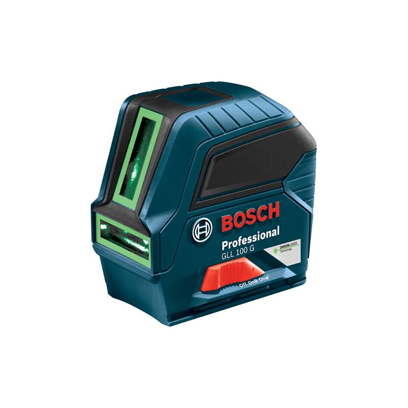 The Bosch GLL 100 G Green-Beam Self-Leveling Cross-Line Laser uses green-beam technology, which generates lines up to 4X brighter than standard red beams. This gives the laser a working range up to 100 Ft. The GLL 100 G produces vertical, horizontal and cross-line modes, and the tool can project two lines independently or together, for a broad array of alignment and leveling applications. It includes Bosch-exclusive VisiMaxTM technology, which allows for outstanding line visibility in standard working conditions. It constantly monitors the laser's temperature so the diodes are always driven to maximum line visibility, while protecting the laser diodes from overheating. The tool has a working range up to 100 Ft., and it offers an accuracy of +/- 1/8 In. at 33 Ft. and +/- 3/8 In. at 100 Ft. The Bosch Smart Pendulum System self-levels and indicates out-of-level condition, to help ensure an accurate layout. It locks the pendulum after the laser is switched off for secure transport. The laser is built with sturdy over-molded construction with an IP54 rating to protect against dust and water. The included BM3 Positioning Device offers quick setup in ceiling grid applications and free-standing mode with its retractable feet and microfine height adjustment.