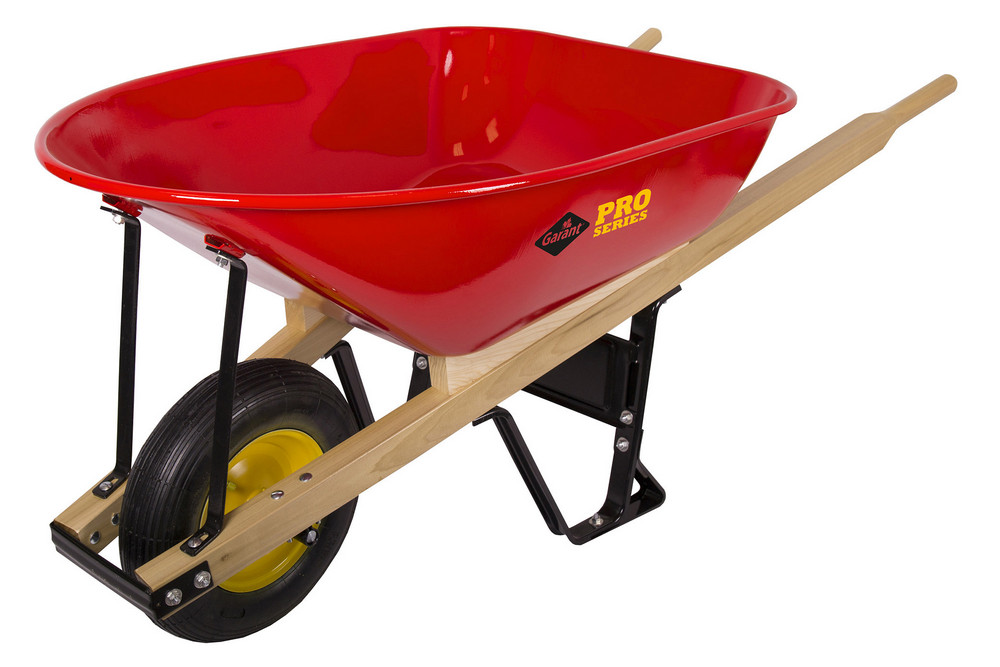 Transport dirt, mulch, gravel, tools, and other material with the help of the Garant Pro industrial wheelbarrow. Its highly visible 6 cu ft tray with a maximum capacity of 600lb (272.1kg) is made of a single piece ultra-robust steel with welded clips under the tray for increased solidity. Its rolled edge in the shape of a funnel with a pouring lip allows for precise and efficient spreading. It has 64 inch (162.2cm) square hardwood handles, one 16 inch (40.6cm) flat-free tire, a steel frame with leg stabilizers, stays and leg shoe pads. This industrial grade Garant Pro wheelbarrow is designed for professionals who want to complete demanding projects that require moving heavy loads.