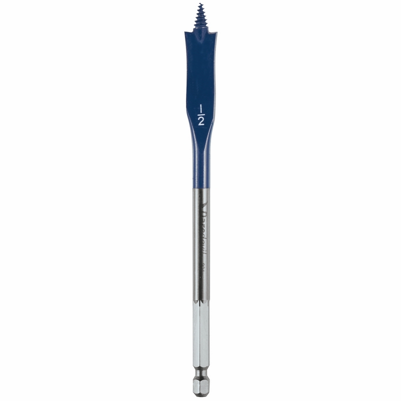 DaredevilTM spade bits are designed for professional users seeking speed, ease of use and hole quality. A full-cone threaded tip pulls the bit through the material with less effort and vibration than other spade bits. The contoured paddle delivers faster chip removal; hex shank with power groove reduces slippage. Up to 10X faster than conventional spade bits.