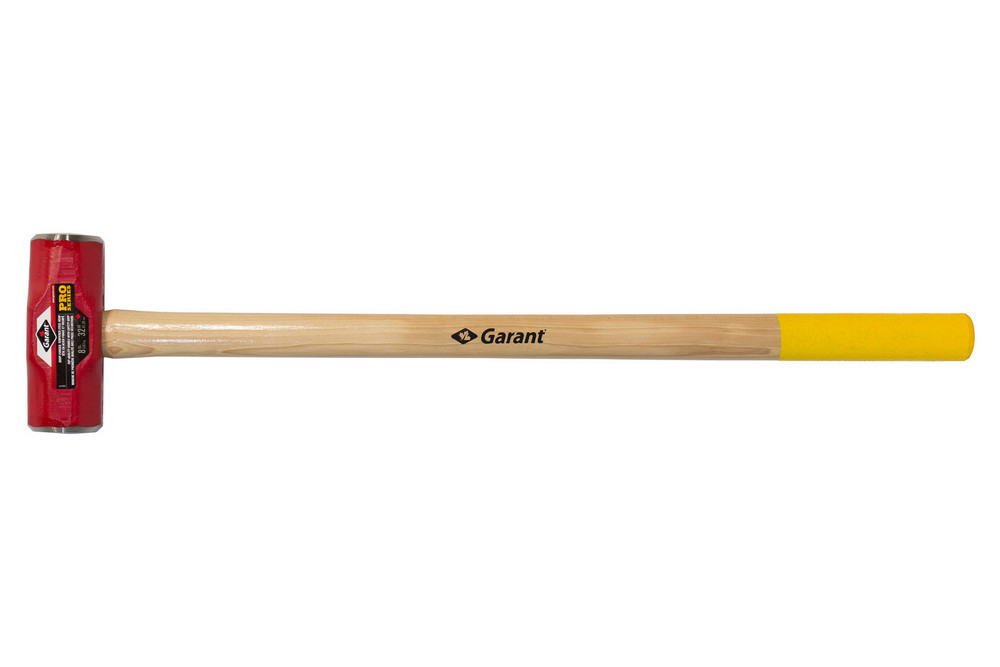 Industrial quality sledge hammer, 8 lbs double face drop-forged and tempered steel head, machine striking faces, red, 32 in. varnished premium hickory handle, non-slip safety grip for sager handling. Used for general sledging operations in striking wood, concrete, metal and stone. Common uses are striking spikes, cold chisels, star drills and hardened nails. Large Canadian eye fitting American eye.