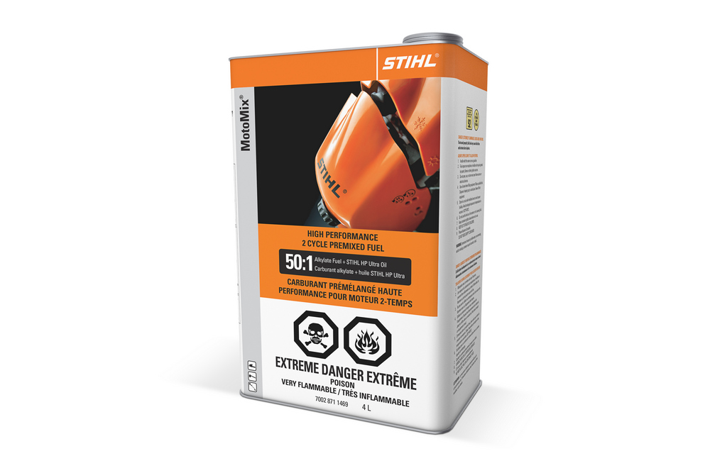 MotoMixTM is the ultimate choice of pre-mixed fuel! It's a perfect worry-free 50:1 mix of 92 octane alkylate fuel with STIHL HP Ultra synthetic biodegradable engine oil. It will give your engine what it needs for performance and protection. With no ethanol, you don't have to worry about damaged seals or any other carburetor issues regular mixed fuel can cause.
